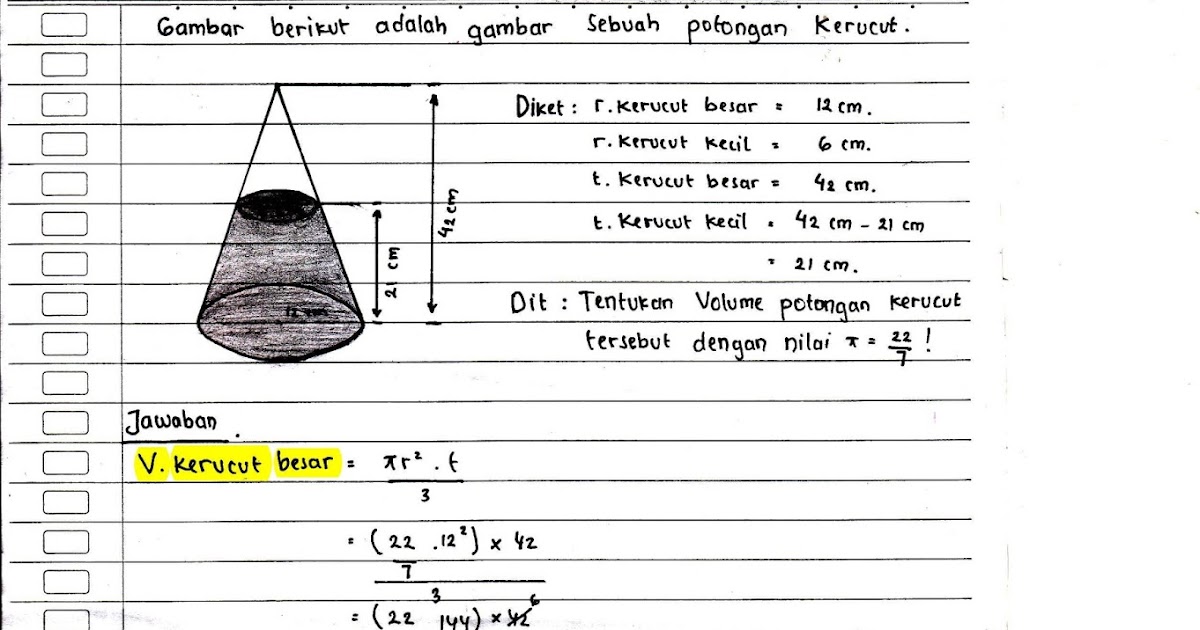 Untuk lebih jelas tentang rumus dan cara menghitung volume bangun ruang mari kita simak. Yang termasuk dalam bangun ruang sisi datar yaitu kubus, balok, prisma, dan limas. Saat ini banyak prodak yang menggunakan bentuk tabung sebagai variasi untuk produk contoh 1: Tabung adalah bangun ruang tiga dimensi yang memiliki alas dan tutup berupa lingkaran yang sama dan sejajar serta memiliki selimut berupa persegi panjang keterangan : Gabungan bangun ruang sisi datar. Volume bangun ruang berikut ini adalah …. Volume bangun gabungan dicari dengan menjumlahkan volume bangun yang membentuk volume bangun gabungan tersebut. Menghitung volume air dalam akuarium kotak. Setelah sebelumnya kita sudah membahas tentang materi selain memiliki volume, bangun ruang juga memiliki luas permukaan. Untuk memantapkan pemahaman mengenai materi tersebut, berikut disajikan soal dan pembahasannya. Juga beberapa gabungan dari ketiga bentuk di atas termasuk juga irisan atau potongan bagian darinya. Sementara untuk bangun ruang sisi lengkung terdiri atas kerucut, tabung. Prisma dapat didenisikan sebuah hasil dari gabungan antara bangun datar 2 dimensi baik dari bangun datar.